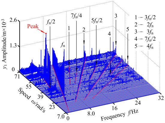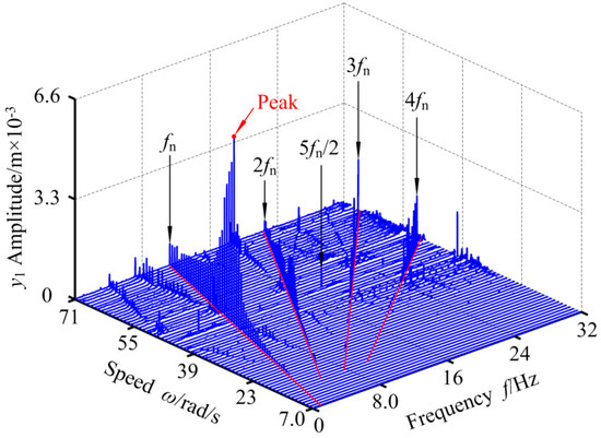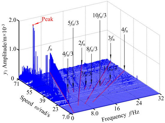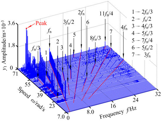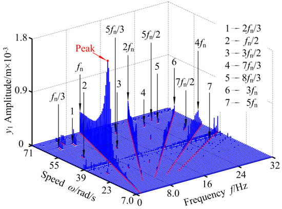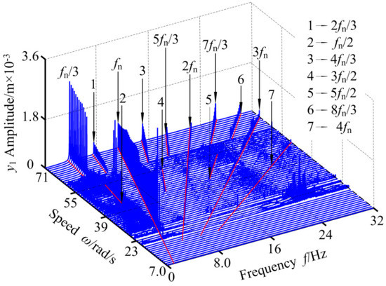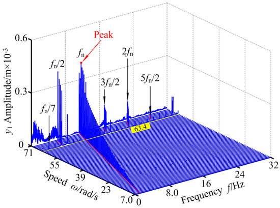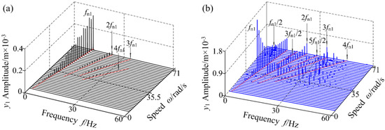 In order to verify the correctness of the non-linear dynamic model built in this paper, the accuracy of the model was verified by comparing it with the models built in the existing literature. In simulation, the parameters given in Table 1 were used in both models. As shown in Figure 3, the three-dimensional spectrum of the model in the Y direction of the rotor is given. Figure 3a is the three-dimensional spectrum of the model in reference [31]. Figure 3b is the calculation result of the model established in this paper. By comparison, it can be found that when the rotating speed is small, the frequency components of the two models are mainly one times frequency conversion fn1, and no rubbing occurs in the shafting. With the increase of rotational speed, the main components of Figure 3a are the frequency multiplication components fn1, 2fn1, 3fn1, and the frequency demultiplication component is not obvious. In addition, the amplitude of one times frequency conversion fn1 shows a fluctuating growth, while the amplitude of other frequency multiplication components increases first and then decreases. In Figure 3b, besides the frequency conversion and frequency multiplication components, there are also obvious frequency demultiplication components, such as fn1/2, 3fn1/2, 5fn1/2, 7fn1/2, etc. The amplitude of each frequency component varies nonlinearly, and at a certain speed, there is an obvious continuous spectrum component in the three-dimensional spectrum. At this time, the system is in a chaotic state, but not in Figure 3a. When the speed reaches 71 rad/s, there are only obvious fn1 and 2fn1 components in Figure 3a. Besides frequency multiplication components, Figure 3b has more obvious frequency demultiplication components.