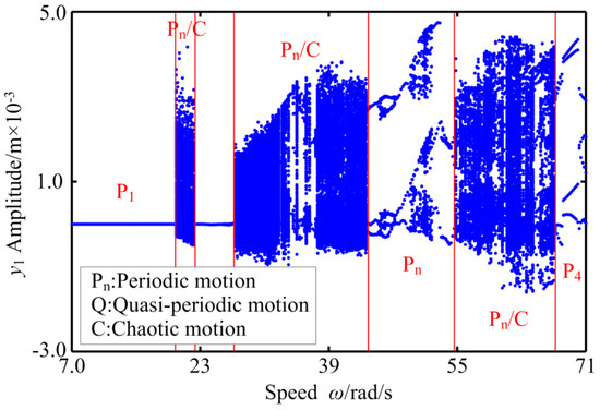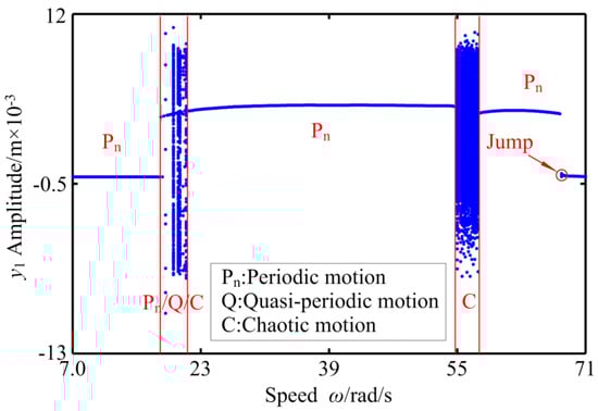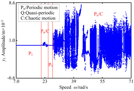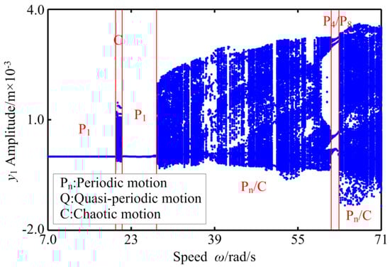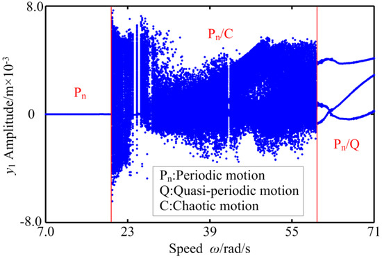 It can be seen from Figure 13 and Figure 14 that when the radial stiffness is small, the coupling system behaves as period 1 and a double-cycle motion, and only the bifurcation path of the period-doubling bifurcation and the inverse period-doubling bifurcation appears, and discontinuous jumps occur in the range of ω ∈ [39.6,52.2] rad/s. In the three-dimensional spectrum, when the rotational speed is small, the frequency components are relatively simple, mainly the frequency multiplication components (fn, 2fn, 3fn,...). With the gradual increase of the rotational speed, besides the frequency multiplication component, the coupling system has unobvious frequency demultiplication components (fn/2, fn/3, fn/4,...) and the frequency demultiplication components alternately appear. The amplitude of the main frequency components increases first and then decreases nonlinearly (when ω = 58.0 rad/s, the c amplitude peak appears at fn). When the radial stiffness increases to kr = 2.6 × 108 N/m, it can be found that the period doubling region widens, the period-doubling bifurcation and the inverse period-doubling bifurcation alternate frequently, and obvious frequency demultiplication components appear, and the transient quasi-periodic motion in high speed region. There is no chaos in the coupling system in the whole speed changing region. As the radial stiffness continues to increase to kr = 4 × 108 N/m, the coupling system exhibits complex nonlinear behavior and more unstable regions; different bifurcation paths, such as saddle-node bifurcation, period-doubling bifurcation, and inverse period-doubling bifurcation, and strong nonlinear phenomena, such as discontinuous amplitude jumps, appear. The chaotic region of the system is mainly concentrated in the three regions of ω ∈ [18.8,52.2] rad/s, ω ∈ [25.6,43.6] rad/s, and ω ∈ [54.6,67.4] rad/s, and with the speed increasing, the chaotic motion region is widened, the intermittent chaotic phenomenon intensifies, and the continuum region increases in the three-dimensional spectrum. At the same time, the vibration system has obvious frequency demultiplication components; mfn/2, mfn/3, mfn/4, and mfn/6 (m: positive integer), and the frequency amplitude of fn/2, fn/3, fn/4 is significantly larger than other frequency amplitudes. In the high-speed region, the system finally transits to a stable period 4 motion through the saddle-node bifurcation, and the jumping and discontinuity of amplitude is enhanced. Table 4 shows the intervals in which the frequency components change (where fn is the frequency conversion).