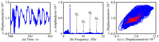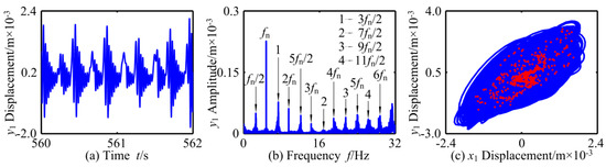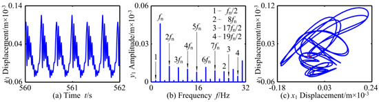 In order to analyze more deeply, the related dynamic responses of the vibration system (kr = 4 × 108 N/m) at ω = 19.2 rad/s, ω = 40.8 rad/s and ω = 69.8 rad/s are displayed in Figure 19, Figure 20 and Figure 21 through waveform, frequency, axis orbit, and Poincaré map. When the rotational speed is small, i.e., ω = 19.2 rad/s, the vibration amplitude of the system is small, and the corresponding main frequency domain components are frequency multiplication (fn, 2fn, 3fn, …) and mfn/2 (m: positive integer) with small amplitude. The coupling system behaves as periodic-2 motion, and its attractors are two points on the Poincaré map. When ω = 59 rad/s, the amplitude of the system vibration response increases and presents a non-periodic change; in the frequency domain, the continuous frequency spectrum components appear, corresponding to the chaotic axis orbit; the attractors on the corresponding Poincaré map are irregular scattered points, and then the system motion is in chaotic state. When the rotational speed increases to ω = 69.8 rad/s, the rotor returns to the periodic motion again, and the vibration response has different frequency characteristics; fn/4 is the main frequency component and has obvious peak value. At the same time, four irregular closed curves are shown on the axis orbit map, and the attractors on the corresponding Poincare map are four isolated points.