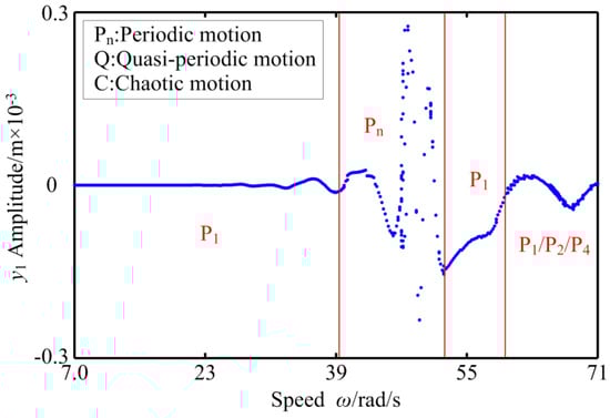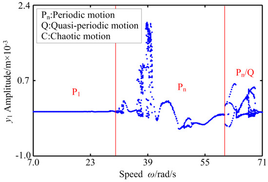 Nonlinear electromagnetic force has an important influence on the inherent characteristics and dynamic response of RBRS, which is one of the important reasons for the nonlinear characteristics of RBRS. In order to study the influence of different excitation currents of the generator Ij on the dynamic characteristics of RBRS, Figure 4 and Figure 5, respectively, give the bifurcation diagram and 3-D frequency spectrum of RBRS with rotational speed ω (ω = 7.0~71 rad/s) as control parameter at Ij = 1000 A.