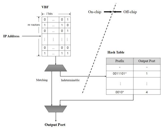 The basic idea of the proposed vectored-Bloom filter (VBF) structure for IP address lookup was briefly introduced in References [31] and [32]. The VBF consists of m multi-bit vectors and each vector comprised of l bits contains an output port. The proposed structure completes an IP address lookup by querying only the on-chip VBF without accessing the off-chip hash table. Depending on how output ports are programmed to the VBF, two different structures are possible [31]. The first structure involves making the l-bit vector represent up to output ports, zero and a conflict value, which is the value of . The conflict indicates that the vector is programmed by two or more different output ports.