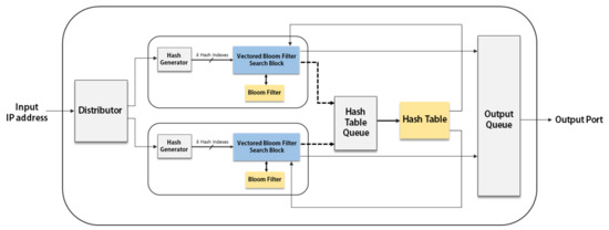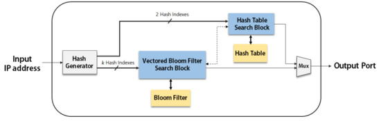 - Byun, H.; Lim, H. IP Address Lookup Algorithm Using a Vectored Bloom Filter. Trans. Korean Inst. Electr. Eng. 2016, 65, 2061–2068. [Google Scholar] [CrossRef]
