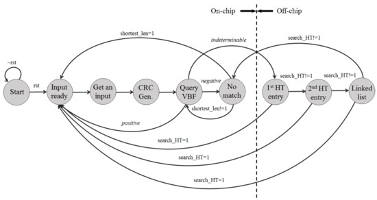 At State 1st HT entry, the hash entry pointed by the first hash index is accessed. If the entry does not have a matching prefix, another entry pointed by the second hash index is accessed at state 2nd HT entry. If the entry pointed by the second hash index does not have a matching prefix, the other entry pointed by the linked list of the second entry is accessed at state Linked list. If the output port is not found in any of these hash entries, the matching prefix does not exist in the current length and the search procedure goes back to state No match and continues to query the VBF with a shorter length. If a matching prefix is found from any of these entries, the search is completed for the current input and hence the search procedure goes to state Input ready for the next input.