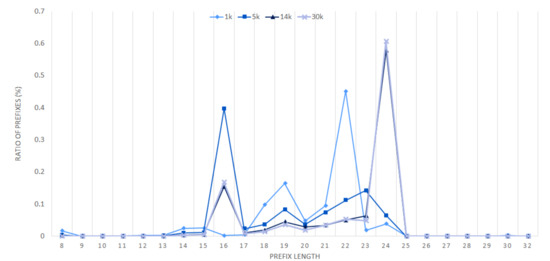 In case of the PBF, for the fair comparison with other structures, we assume that all of the BFs in the PBF structure are sequentially queried until the longest prefix is matched as in the VBF. Hence, the is constant regardless of the size of the Bloom filter because Bloom filter querying always stops at the length of the matching longest prefix. In other words, starting from the longest length, the Bloom filter querying always continues until a true positive occurs and hence the average number of Bloom filter querying is not related to the size of the Bloom filter. The of the VBF in 5 k is greater than that in other sets, because the 5 k set has many short length prefixes, such as length 16, as shown in Figure 6. Since the search procedure proceeds from the longest length, if the prefix matching occurs in a short length, the becomes large.