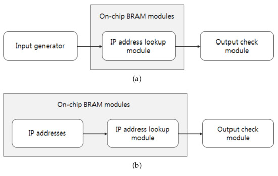 Figure 7 shows the hardware test flow. Generally, the input IP addresses should be provided by an external input generater, as shown in Figure 7a. However, in our experiment, the input IP addresses are stored in a BRAM, as shown in Figure 7b, in order to provide the input at the operation rate of the hardware implemented on the FPGA. The input IP addresses are stored in dual-port RAMs and hence the parallel architecture can process two IP addresses in parallel.