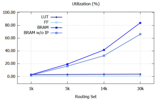 Figure 8 graphically shows the resource utilization. Since the utilizations of IO and BUFG do not depend on the sizes of the routing sets, their utilizations are not shown. The utilizations of LUT and FF are almost constant, even when the size of the routing set increases. BRAM w/o IP refers to the BRAM utilization when input IP addresses are not stored in BRAMs, as shown in Figure 7a. In this case, the BRAM utilization reaches up to 66.1%, which is substantially lower than 84.0%.