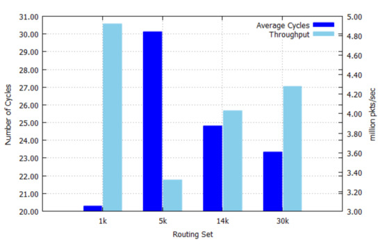 - Gupta, P.; Lin, S.; Mckeown, N. Routing Lookups in Hardware at Memory Access Speed. In Proceedings of the IEEE INFOCOM ’98, the Conference on Computer Communications. Seventeenth Annual Joint Conference of the IEEE Computer and Communications Societies. Gateway to the 21st Century, San Francisco, CA, USA, 29 March–2 April 1998; pp. 1240–1247. [Google Scholar] [CrossRef]