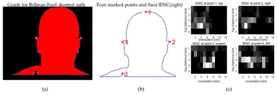 In order to establish the initial correspondences between the two feature point sets of visible and infrared face images, we first use IDSC as the local feature descriptors, and solve the point sets matching problem through a bipartite graph method [32]. Compared to the SC feature matching method, the IDSC feature matching method uses inner-distance to replace the Euclidean distance, which is robust to articulation shape and part structure. For example, Figure 2 shows the schematic illustration of face silhouette feature descriptors based on IDSC, in the IDSC feature histograms from Figure 2c, the horizontal axis nθ = 12 denotes the numbers of orientation bins and the vertical axis nd = 5 denotes the numbers of logarithm distance bins.