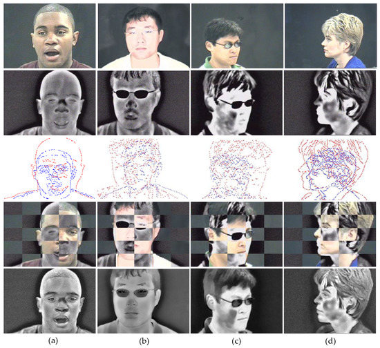 In order to obtain a qualitative evaluation of the registration results issued by the software-based registration process in Figure 1, several typical frame pairs of four individuals involving different poses and illumination changes are given in Figure 4a–d. Specifically, the original visible images and thermal infrared images are shown in the first and second row, respectively. Then the middle row shows the edge maps extracted by the canny edge detector. We use the red point set to denote the edge map of the thermal infrared images, and the blue point set corresponds to the edge map of the visible images. Subsequently, the visible image is aligned to the thermal infrared image by our FR-GLS method, and the registration performance is demonstrated by the checkerboard in the fourth row, where the aligned visible image is superimposed onto the corresponding thermal infrared image. We can see that the seams between two grids in the checkerboard are natural, and this demonstrates the feasibility and effectiveness of the proposed registration method qualitatively. Finally, the last row represents the fusion results of the visible and thermal IR images by our GF-GP method. We can see that the fused images in the last row contain both the apparent details of the visible image and the thermal radiation information of the infrared image, which can be clearly seen from noses, cheeks, ears, mouths and glasses. Therefore, it will be beneficial for the performance of follow-up face detection and recognition under the case of illumination changes or disguise.