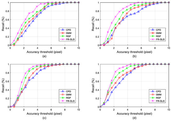In order to give a quantitative comparison of our FR-GLS and other typical methods, such as CPD [19], RGF [20] and SMM [25], we further utilize several visible and infrared image pairs of the four individuals in Figure 4, and manually selected several landmarks and their correspondences (about 20 pairs) in each visible and infrared image pairs as ground truth. For example, the landmarks involve the salient features like the cheeks, eyes, nose, mouth, eyebrows, ears and glasses, which are highly distinguished. Referring to the metric used in [20,21,35], the recall rate is proposed to be a qualitative indicator for evaluating the registration results on all landmarks set pairs of an individual. Here the recall rate, or true positive rate, is defined as the proportion of the true positive correspondences between the landmark pairs to the ground truth correspondences, and a true positive correspondence is counted when the pair falls within a given accuracy threshold of Euclidean distance. Here the Euclidean distance can be defined as 2-norm between a landmark in the aligned feature point set of visible images and the corresponding landmark in the feature point set of infrared images. The recall curves plot the recall rates under different threshold values.