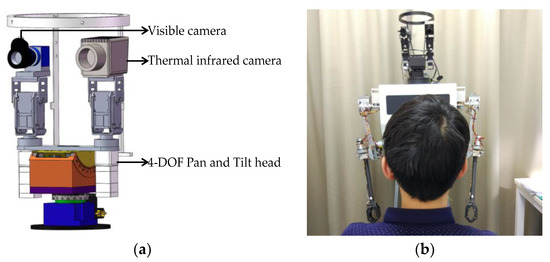 This 4-DOF pan and tilt head vision platform can realize up-down pitch movement and left-right yaw movement, respectively. Moreover, a Belgium Raven-640-Analog thermal infrared camera with 10 mm short lens is used to acquire a 74° × 59° field of view (FOV) infrared image (Figure 6a left), while a DAHENG MER-310-12UC color camera with an Optotune EL-10-30-Ci variable-focus liquid lens is used to acquire a 28° × 22° FOV visible image (Figure 6a right). Meanwhile, a visible image is always taken simultaneously with the infrared image to form a multi-spectral image pair, and the visible and infrared images are both compressed into 640 × 480 pixels. The multi-spectral vision equipment and image acquisition scenario is shown in Figure 6b. The self-built multi-spectral database is composed of 20 different individuals involving different illumination conditions and pose variations. In addition, for each individual, the sampled images are captured from 13 different angles (tilt head from −90° to +90°) and two illumination conditions (dark and light).