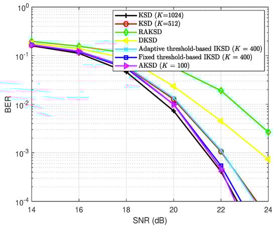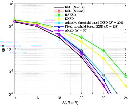 In Figure 1, the BER comparison results for a MIMO system with , , and 16-QAM are shown. We can observe that the AKSD scheme with relatively small K achieves comparable or better BER performance with respect to the conventional KSD scheme with large K. Specifically, the performance of the proposed AKSD with is nearly the same as that of the conventional KSD with at high SNRs, where the AKSD achieves an SNR gain of 0.7 dB over the conventional KSD with at BER . Figure 1 also shows that the AKSD scheme achieves better BER performance compared to the adaptive threshold-based IKSD and fixed threshold-based IKSD. The SNR gains of the AKSD at BER over the adaptive threshold-based IKSD with and the fixed threshold-based IKSD with are approximately dB and dB, respectively. Moreover, the AKSD scheme outperforms both the RAKSD and DKSD by approximately dB and dB, respectively, at a BER of .