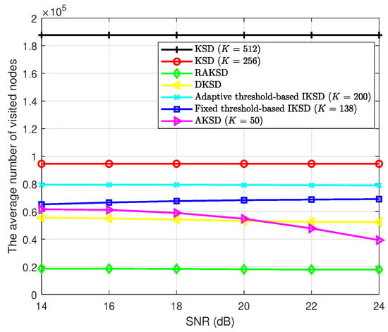 Figure 4 illustrates the comparison of the average number of visited nodes for a MIMO system with , and 16-QAM. Similar to Figure 3, it is seen that the proposed AKSD scheme provides significant complexity reduction compared to the other existing schemes that provide comparable performances, i.e., the conventional KSD and IKSD. The complexity reduction ratio of the AKSD at SNR dB with respect to the conventional KSD with is approximately . Furthermore, at SNR dB, the AKSD scheme achieves approximately and complexity reduction compared to the adaptive threshold-based IKSD and fixed threshold-based IKSD with , respectively.