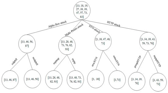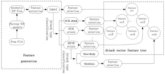 Extracting the important features of the DDoS attack type is very important for early detection of DDoS attacks []. A type of DDoS attack tends to highlight several important features. In other words, several features can characterize a DDoS attack. If we can acquire some features, we can lock the DDoS attack type range, which will greatly help the later DDoS mitigation. According to the method proposed by researchers in [,,,], each attack vector can be characterized by feature subsets to construct the attack vector feature tree. When a DDoS attack occurs, the attack feature tree can be used to quickly locate the DDoS attack type.