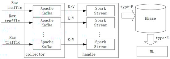 To quickly extract DDoS features, this paper builds a big data processing framework. The processing flow is shown in Figure 2. Kafka [] is a message queuing system that can be published and subscribed. Mainly considering the achievability of engineering practice, we, therefore, joined kafka in the experiment. Kafka has a buffering effect, and with kafka the big traffic DDoS attack will not rush our services. Kafka often used to collect real-time data from applications, the data format that Kafka sends to consumers is <key, value, timestamp>. Spark Streaming is a consumer of data. It is an extension of the core Spark API that enables scalable, high-throughput, and fault-tolerant stream processing of real-time data streams. Hbase is a distributed storage database that can store data with different key values at different times. First, the framework parses the fields of each packet of the pcap file into a text file, that is, a packet is parsed into a row of data. Kafka sends the parsed data to SparkStreaming. The data format = <K, V>, where K = sip#dip#sport#dport#protocol is a typical quintuple for reconstructing TCP/UDP flows, V = data packet arrival time, packet size, IPgram, the text version number, the IP header length and other IP packet fields, the TCP packet fields, and the UDP packet fields. SparkStreaming then compares K with K_i in the list to determine whether the stream is normal traffic or attack traffic. List is the label we manually identify (normal, SYN flood, or other), and a quintuple is used to represent a TCP flow or a UDP flow, such as List = [<K1, type1>, <K2, type2> ... <Ki, typei>], where Ki represents the quintuple of a TCP flow or UDP flow i, and i indicates the attack type of a TCP flow or UDP flow i. After comparison, we obtain <K, V, type>, which determines the label of each packet. Finally, it is stored in Hbase in the form of < type, E >, where type refers to the attack type and E refers to the statistical feature set. To calculate <K, V, type> and convert to <type, E>, the specific algorithm is as follows: