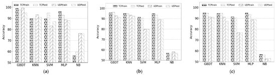 KNN, SVM, NB, and MLP(Multi-Layer Perceptron) algorithms are algorithms that are often used in intrusion detection algorithms. Here, the paper compares the GBDT algorithm with KNN, SVM, NB, and MLP in the three aspects of accuracy, running time, and the ROC(Receiver Operating Characteristic) curve. The GridSearchCV adjustment parameters are optimized for KNN, SVM, and NB algorithms, but it is difficult for MLP to determine the optimal parameters. It can only adjust a good effect according to personal experience. The results are shown in Figure 3, Figure 4 and Figure 5, respectively. In the TCP flow, the attack traffic types are salphfl, malphfl, alphfl, mptmp, mptp, ptmp, ntscSYN, sntscSYN, ptmpHTTP, and mptpHTTP. In UDP flows, the attack traffic type refers to ptpposcaUDP. These types of attacks come from the division of the WIDE dataset [], such as the attack type ntscSYN, which refers to network_scan_SYN. Random extraction of 1 k, 10 k, and 100 k TCP or UDP datasets from the Hbase database is performed. This paper uses GBDT, KNN, SVM, NB, and MLP as the five machine learning algorithms to classify 1 k TCP and 1 k UDP datasets. The results show that when classifying TCP traffic, the training accuracy of the GBDT algorithm reaches 0.99, and the test accuracy rate reaches 0.98. The training accuracy of the KNN algorithm reaches 0.89, and the test accuracy rate is 0.9, while the training accuracy and test accuracy of SVM algorithm are 0.89 and 0.95, respectively. The training accuracy and test accuracy of the MLP algorithm are 0.96 and 0.93, respectively. The lowest is the NB algorithm, and the training scores and test accuracy rates are 0.56 and 0.6, respectively. It can be seen that the accuracy of the GBDT algorithm is significantly better than that of the other algorithms when the dataset’s size is 1 k. As the amount of data increases, the accuracy of the GBDT, KNN, SVM, and MLP algorithms decreases, but the accuracy of the NB algorithm barely fluctuates, and the accuracy is poor. The NB algorithm is suitable for datasets with few features, and eigenvalues that are discrete values and few in number. The features extracted in this paper are continuous values and have 102 features, which is obviously not suitable for NB algorithm. When the dataset’s size is 10 k, the training accuracy and test accuracy of the GBDT algorithm are reduced, which are 0.959 and 0.962, respectively. The accuracy of the test is higher than that of the KNN, SVM, and MLP algorithms. Similarly, when the amount of data is increased to 100 k, the test accuracy of the GBDT algorithm is higher than that of the KNN, SVM, and MLP algorithms. For UDP flows, when the dataset’s size is 1 k, the training accuracy and test accuracy of the GBDT algorithm are 0.994 and 0.95, respectively. Regardless of the training accuracy or the test accuracy, the GBDT algorithm achieves better results than other algorithms. As the size of the datasets increases, the accuracy of all algorithms decreases. However, the performance of the GBDT algorithm is superior to other algorithms. The reason for the decrease in accuracy may be due to the inaccurate direction of the flow during the feature extraction phase. In general, the training accuracy and test accuracy of TCP are higher than the training accuracy and test accuracy of UDP in the corresponding algorithm because TCP traffic has a richer DDoS attack signature.