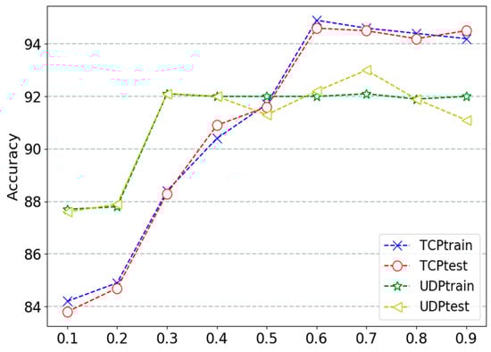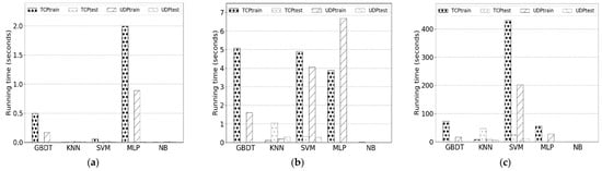 In terms of training time, as the amount of data increases, the training time of the GBDT algorithm also increases, and the training time of the GDBT is not optimal in the five algorithms. However, when the data volume is 100 k, the GBDT test time on the TCP datasets is only 0.031 s, and the test time on the UDP datasets is only 0.023 s, which is smaller than that of the KNN, SVM, and MLP algorithms.
