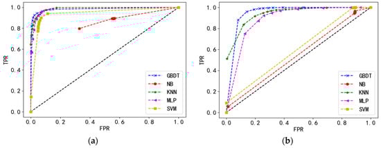 As shown in Figure 4, the training time and test time of the SVM algorithm are very long. When the dataset’s size is 100 k TCP datasets, the time used is 451 and 25.22 s, respectively. When the dataset’s size is 100 k UDP datasets, the time used is 202 and 9.973 s, respectively. The MLP algorithm also takes a long time. The training time and test time are 28.456 and 1.02 s, respectively, compared to the 100 k TCP datasets. Although the training time of the KNN algorithm is relatively short, the test time is relatively long. The test times for the 100 k TCP datasets and the 100 k UDP datasets are 47.77 and 6.925 s, respectively. The test time is very important for DDoS detection. The shorter the test time, the earlier it is possible to detect whether a DDoS attack has occurred, thus preventing the DDoS attack from posing a greater threat to the server. Obviously, the GBDT algorithm is superior to the other algorithms in terms of accuracy and test time performance. The comparison of the ROC curves of the GBDT algorithm with other algorithms is shown in Figure 5. The ROC curve of the GBDT algorithm encloses the ROC curve of the other algorithms. In summary, the time to detect DDoS attacks with the GBDT algorithm is shorter than that of the other algorithms, and the accuracy of detecting DDoS attacks is higher than that of the other algorithms. Therefore, the GBDT algorithm is selected as the DDoS attack detection classifier.