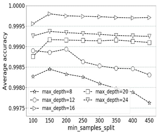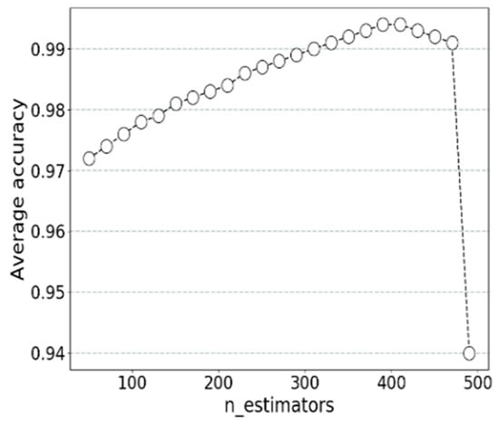After the feature selection, in order to obtain higher accuracy, it is necessary to adjust the parameters of the GBDT algorithm. The optimization of the GBDT algorithm’s parameters ensures that the GBDT algorithm achieves better detection accuracy and better generalization ability. There are four main parameters of the GBDT algorithm, namely, the number of the largest weak learner (CART tree), the subsampling, the condition of the subtree’s continual division, and the maximum depth of the subtree. The number of the largest weak learners is represented by n_estimators, such that when n_estimators are too small, it is easy to underfit; in contrast, when n_estimators are too large, it is easy to overfit. The sampling uses the subsample to indicate that the GBDT algorithm does not put back the sample. If the value is less than 1, only a part of the sample will be used for the decision tree fitting of GBDT. The condition in which the tree continues to be divided is represented by min_samples_split, which limits the conditions under which the subtree continues to be partitioned. The maximum depth of the tree is represented by max_depth, which can easily cause overfitting. These four parameters are important for creating a robust GBDT model.