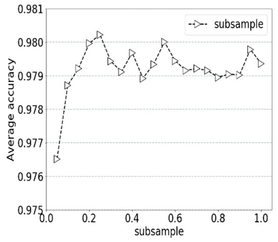 This article starts with the number of weak learners (n_estimators). The result is shown in Figure 6. When n_estimators = 400, the training accuracy is optimal. The accuracy of the number of iterations drops rapidly after 400. Figure 7 shows that the maximum depth max_depth is not as large as possible, and the minimum division set min_samples_split is not as small as possible. When the maximum depth max_depth is small, the effect decreases as the minimum division set increases. When max_depth = 16, min_samples_split = 150, and the precision is 0.9997. Figure 8 shows that the subsample value 0.25 is optimal. This paper uses the parameters n_estimators = 400, max_depth = 16, min_samples_split = 150, subsample = 0.25 as the optimized model.