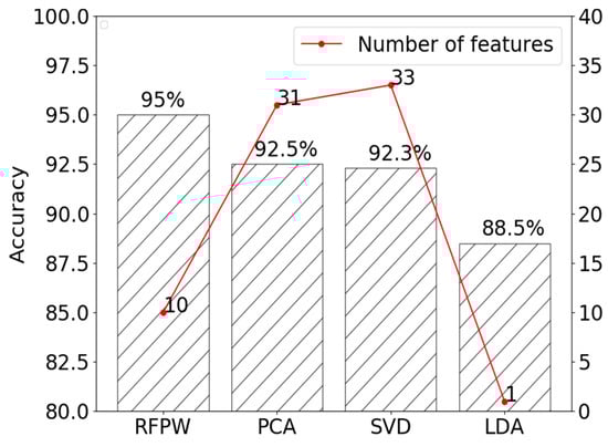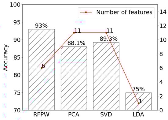 This paper proposes a feature selection method based on a random forest and Pearson correlation coefficients. The random forest is used to calculate the importance score for each feature. The features with a feature importance score that is higher than Ω are then combined into a feature subset. The pairwise features of the resulting feature subset are calculated for their Pearson correlation coefficients. The feature for which the Pearson correlation coefficient > ρ0 (ρ0, the Pearson correlation coefficient threshold) has the smallest importance score is removed. The remaining feature subsets are sequentially input into the GBDT algorithm. If the feature and the previous feature together improve the test accuracy of the GBDT algorithm, the feature is selected as the result feature; otherwise, the feature is not added as the result feature. The specific algorithm is shown in Algorithm 1. The Pearson(i, j) function of the fifth line of the algorithm refers to the Pearson correlation coefficient for calculating the feature i and the feature j. Line 7 describes that if the Pearson correlation coefficient of feature i and feature j is greater than ρ0, then features i and j are added to the list. In the algorithm, list refers to a list of feature sets, for example list = [[1, 2], [4, 5], [5, 13]], where the Pearson correlation coefficient of features 41 and 42 is greater than ρ0, so feature 41 and 42 join the list, resulting in a new list given by list = [[1, 2], [4, 5], [5, 13], [41, 42]]. Line 8 refers to the combination of two related features, such as combining the two related features in the list to obtain list = [[1, 2], [4, 5, 13], [41, 42]]. The function of lowerscore(h) on line 10 indicates that features with lower importance scores are obtained. For example, when h = [4, 5, 13], feature 4 scores the highest, so the function lowerscore(h) returns the set [5, 13]. The 14th line shows the function CroossGBDT(A2, k), which refers to a new feature subset consisting of a feature subset and a feature k, and the new feature subset is input into the GBDT algorithm to return the test set. The feature selection algorithm in this paper is called RFPW (random forest and Pearson wrap).