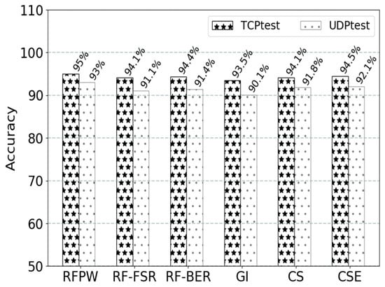 For the TCP flow, this paper simply collects 102 features using the GBDT algorithm without optimization to achieve a test accuracy of approximately 95%; for UDP flows with a total of 49 features, the GBDT algorithm achieves a test accuracy of 91%. The selected features of Appendix A Table A1 and the GBDT algorithm are valid for DDoS attack traffic detection. However, due to the large number of features, feature selection is required to improve the generalization ability of the algorithm and shorten the detection time.