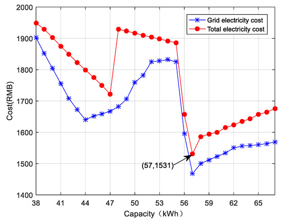 Figure 9. The fluctuations of each cost are not exactly same. It can be found that the grid electricity cost reaches the local optimal when the capacity is 44 kWh, but the total electricity cost is not the minimum at this time. The total cost continues to decline until the local optimum is achieved at 47 kWh, after which the search continues and the optimal capacity is finally determined to be 57 kWh, which is the total storage capacity that the microgrid should order from the CES system.