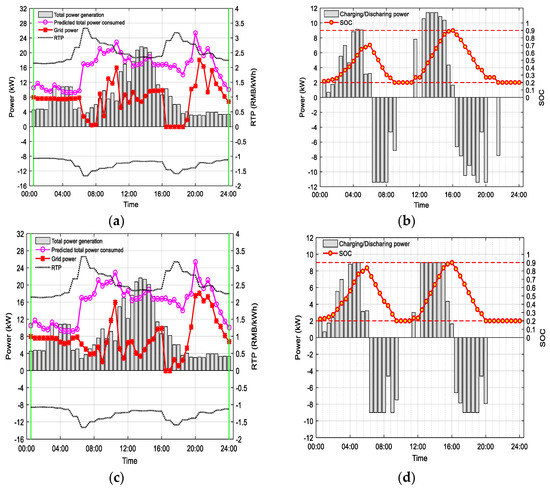 Figure 10c, it can be found that the generation peak is located at 4:00 and 14:00. This is because wind-power generation is relatively large due to high wind speed in the early morning, and the light at noon leads to more photovoltaic power generation. However, it does not generate enough electricity to meet the demand of the microgrid. Therefore, users still need to purchase electricity from the grid and the total power purchased is shown as the grid power curve in