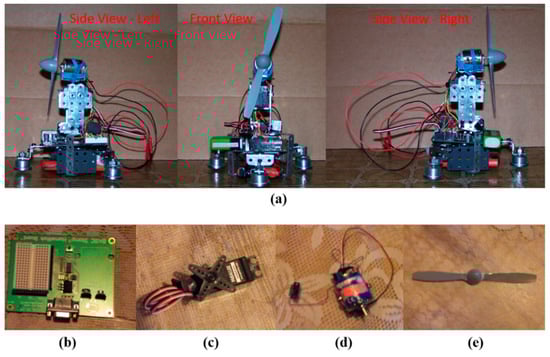 (a) Overview of the air-based propulsion to a land-based holonomic vehicle. Main components are: (b) Microcontroller board, (c) continuous-rotation servo motor, (d) direct current (DC) motor and (e) propeller.