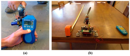 In the first test, the RPM of the propeller was measured by using a handheld tachometer (Figure 2a). The measurements were taken at the propeller’s maximum RPM and at the minimum RPM needed to start the vehicle in motion. The results of the tests gave a range of 8000 to 13,000 RPMs. With these results, the range of efficiency was determined.