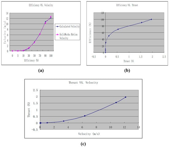 The efficiency and thrust of the propeller system determines the velocity of the vehicle. To better understand the relationship between the efficiency of the propeller system, thrust of the propeller system and velocity of the vehicle, Figure 4a,b have been created. The maximum efficiency of the propeller system is assumed to be 100%. By setting the efficiency of the propeller system into eight efficiency levels within the range of 0% to 100%, the corresponding values of the thrust can be calculated from Equation (4). The average error was 12.02% when comparing the velocity between the experimental result and the one from the simulation using SolidWorks. The results suggest that using SolidWorks Motion is an alternative way to find the velocity of a vehicle.