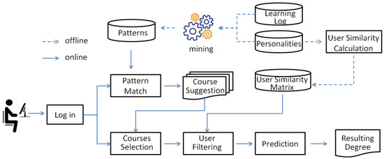 As discussed in the previous section, the main goal of a good course selection system is to provide appropriate support when choosing courses. To address this concern, in this paper, a course decision assistant is presented to associate the learner interests with the available courses by mining personalities. For this purpose, the proposed system is divided into two stages: offline data engineering and online prediction, as shown in Figure 2.