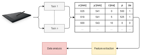 The studies investigating the application of dynamic handwriting analysis in neurodegenerative diseases assessment typically follow a common experimental setup including data acquisition, feature extraction, and data analysis (Figure 1). These issues are discussed separately in the following subsections.