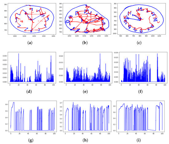Clock drawing test (CDT) performed by a healthy control, a PD patient, and an mild cognitive impairment (MCI) subject: From top to bottom are the rendered task (the on-surface movement is in blue color; the in-air movement is in red), the velocity profile, and the pressure profile. It is recognizable how the PD patient tends to alter the figure dimensions, while the MCI subject missed the correct time. The velocity and pressure profile show more peaks, highlighting a movement which is characterized by less fluency and more changes of direction than the healthy handwriting. (Data have been acquired within the Handwriting Analysis against Neuromuscular Disease project—http://hand-project.di.uniba.it/). (a) Healthy CDT, (b) PD CDT, (c) MCI CDT, (d) healthy velocity, (e) PD velocity, (f) MCI velocity, (g) healthy pressure, (h) PD pressure, and (i) MCI pressure.