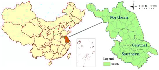 Jiangsu Province is located in the Yangtze River Delta and covers an area of 102,600 square kilometres (Figure 1). By the end of 2014, the population was over 76 million. This province is located in the most economically developed region of the country and is the fastest-growing province. Around the Yangtze River, Jiangsu is divided into three major regions, namely the Southern, the Central and the Northern, and the economic development between the north and the south is uncoordinated. Particularly, the Southern part, popularly called SuNan, has become a model of economic growth in China. The density of the expressway network across Jiangsu ranked the first in China in 2015 [26].