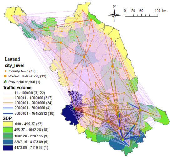 In the case of transport flows at county level across a province, the pushing force at the county of origin is represented by its total population, Tpop i , and the pulling force at the destination county by its total GDP, GDP j . A negative exponential function is suitable for the distance decay at the regional scale. The expressway network distance used for this case study was calculated using ArcGIS 10.5 Network Analyst.
