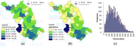 Economy, population and distance have been proven to be the most important factors in driving geographical mobility (such as migration [28], tourism [29] and commuting [30]). In this study of regional mobility, the total population in the origin county was treated as a pushing force. Also, the GDP was selected as a pulling force in the destination county as a higher GDP generates more economic activity. Distance, in this case, the road network distance, is a spatial barrier for movement. The spatial distributions of GDP at the county level are displayed in Figure 3. The distance between counties was measured using Baidu maps, and its histogram displayed in Figure 3c. Traffic volume data between counties is shown in Table 1.