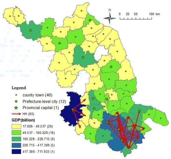 There were 3481 routes (= 59 × 59) between 59 counties (Figure 2). Statistically, the average transport flow between counties was 67,256.29 and the standard deviation was 424,074.9. A small number of transport flows (less than 100,000) were mainly located in northern Jiangsu, while a large number of transport flows were mainly concentrated in southern Jiangsu, which are mainly from Nanjing, Wuxi and Suzhou to the surrounding areas. Part of the transport connecting Xuzhou, Huai’an and Yancheng regional central cities contains more than 100,000 transport flow data. Among all transport flows, there were 10 traffic routes with more than 3 million flows, accounting for 24.43% of the total transport flows, dominating the expressway network. There were 32 traffic routes between 1 and 3 million, accounting for 21.47%. There are 2214 smaller routes (less than 10,000), accounting for only 2.71% of the total transport flows. The county-level network in southern Jiangsu was mainly composed of a small amount of high-volume, and the distribution of transport flow in the entire study area was obviously unbalanced.