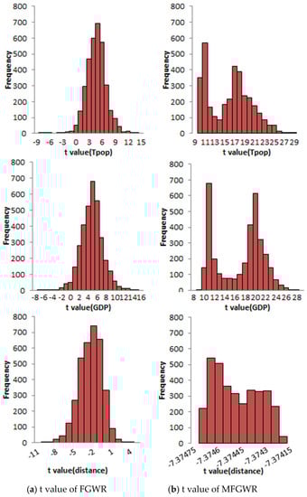 where b l indicates the bandwidth for calibration of the lth conditional relationship for l = { 1 ,   2 ,   3 ,   ,   n } and ij represents the location of flow from origin site i to destination site j. That is to say, there are four explanatory variables (including a constant) in the MFGWR model of transport flow, so each explanatory variable has its own spatial bandwidth in the regression analysis. Each flow has a set of parameters together with other local statistics, such as residuals and t-statistics.