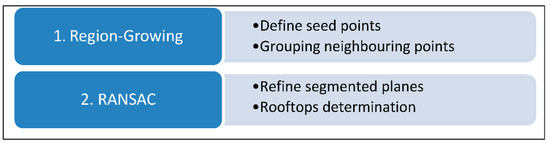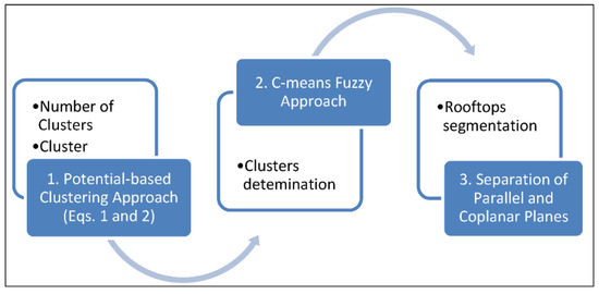 This study aims to present an investigation and critical comparison of two different fully automatic approaches for roof segmentation used in 3D building reconstruction. In particular, we present a stable solution approach (a), described in Section 2.1, for building roof extraction based on a fuzzy c-means [19] that uses a potential-based clustering method for initial clusters center determination and clusters number determination [20,21]. At the end of the clustering processes, a density-based and connectivity analysis, as proposed by [7], is used to improve the results of the above clustering process through separation of the planar and coplanar planes. Moreover, a second approach (b), based on a region growing segmentation method [22] using smoothness constrain and curvature consistency refined with application of RANSAC [23] to remove any potential over-segmentation issues, is described in Section 2.2.