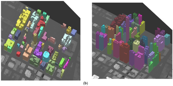 Results of 3d buildings reconstruction over downtown Toronto (Canada) using (a) the clustering roof segmentation approach and (b) the region growing approach.