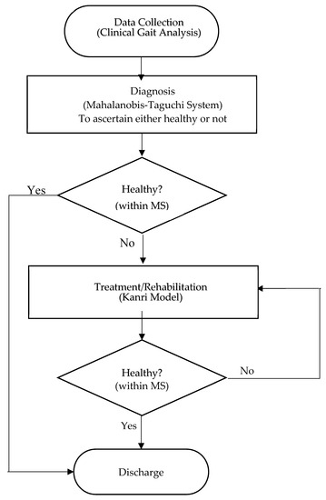 In this study, we proposed a combination MTS–KDC approach for health management. This approach included data collection on the gait of the individuals, and the health of each individual was determined by performing MD for each individual [19]. After that, the participants would be given a tailored prescription to improve their health, as demonstrated in Figure 1.