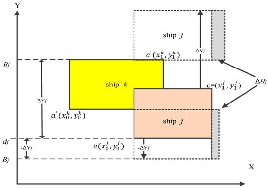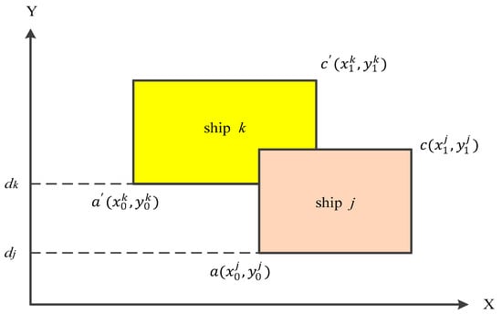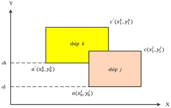 A berth plan can represent a solution to the CBAP. Figure 3 illustrates a berth plan in which the X-axis represents the time dimension (planning horizon), while the Y-axis represents the space dimension (quay length). This plan includes one overlap of two ships j and k that are respectively located at positions at a () and , where are berthing times and are berthing positions. However, this overlap makes this plan unfeasible. To be feasible, it needs to resolve this overlap. A ship being selected and moved to resolve an overlap is termed “target ship”. It is noted that the arrival time (ETAj) and the desired berthing position (dj) are the best coordinates in a berthing plan for a ship j, as there are no increased waiting or handling times. Any deviation from these coordinates will increase the cost for the ship.