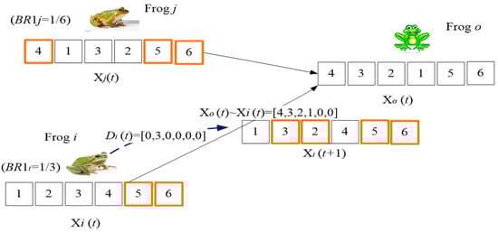 With Equation (1), the best frog in each memeplex has the highest probability 2/(n + 1), while the worst frog has the lowest probability 2/n(n + 1), of being selected into a corresponding sub-memeplex. Then, Roulette Wheel Selection (RWS) can be used to select q frogs from the original memeplex into the sub-memeplex for evolution and local searching. At the current time t, the leaping distance of the frog f is denoted as and determined by Equation (2).