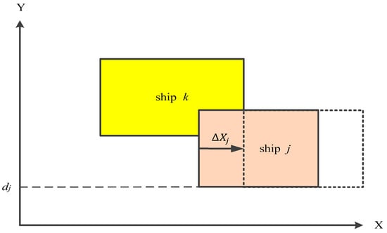 In Figure 1, one way of resolving the overlap is to move ship j in the +X direction. This will not increase the handling times, but rather the waiting times of the ship. The increased waiting times () for a ship j can be estimated by Equation (8), where is the start berthing time of the ship j.