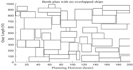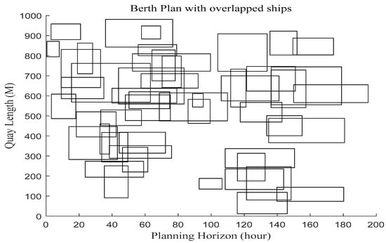 Table 3 shows the original and repositioned data of a large-sized experiment with N = 50 ships. The 1st column shows the ship ID (SID); the 2nd column shows the ship length; the 3rd column shows the Estimated Time of Arrival of ship j (); the 4th column shows the desired berthing position of ship j (); the 5th column shows the original coordinates of ship j (, , , ); the 6th column shows the repositioned coordinates of ship j (, , , ); the 7th column shows the increased waiting time of ship j (); the 8th column shows the increased handling time of ship j (). Figure 13 shows a berth plan that is unfeasible due to the overlapping of the ships, based on the original coordinates of ships. To derive a feasible solution, it is necessary to resolve all overlaps of ships. Figure 14 shows the feasible berth plan obtained from the ISFLA after resolving all overlaps among the ships. In Table 3, the bolded figures indicate updated coordinates for those target ships that were repositioned to avoid overlapping.