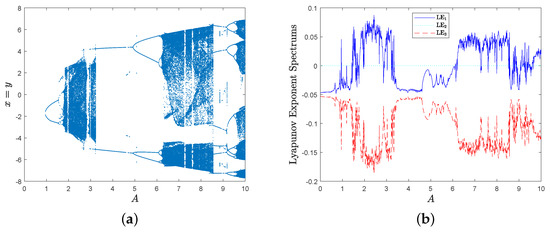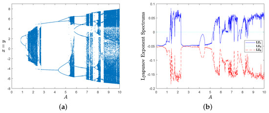 Then, the bifurcation diagram spectrum with respect to parameter A is given in Figure 4a, and the corresponding Lyapunov exponent spectrum with respect to parameter A is shown in Figure 4b.