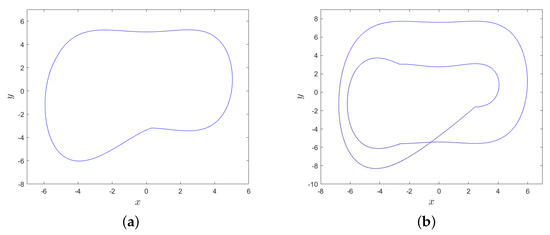 Furthermore, there are no positive Lyapunov exponents in interval , i.e., one is equal to zero, and the others are negative; so, MD System (10) behaves periodically and there exists a limit cycle. For example, the phase diagram of MD System (10) is shown in Figure 5a when parameters , and there exists a limit cycle when . Similarly, MD System (10) behaves periodically too when , and there exists a limit cycle in Figure 5b when .