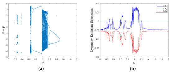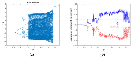 then the bifurcation diagram with respect to parameter and the corresponding Lyapunov exponent spectrum of MD System (10) are shown in Figure 7a,b. There are some parameter intervals in that MD System (10) has a positive Lyapunov exponent, for example, it is chaotic in .