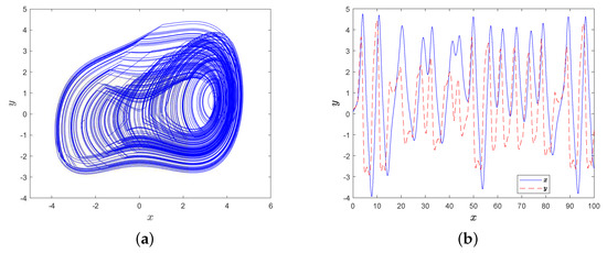 where , is the m-th value of variable , h is the calculation step, and are the derivatives of and in Equation (10). If initial value , step h, length of time T, and total iteration N are given, then one gets chaotic sequence in the length of N.